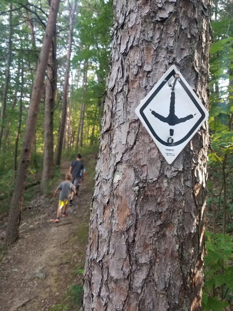 Our Barkley buddy passes us after the first mile, just beyond the peak of the mountain. There weren’t any other cars in the parking lot when we left, so I let the boys run ahead while I relieve myself of my morning coffee. While going #1, I hear this constant metal clicking noise, I can’t place it. I know it isn’t a hiker, but it’s coming from the direction of the car. I barely have time to zip my shorts when a mountain biker comes around the blind corner. My hands are still at my groin, I yank them away (which looks even more suspect). He splashes through my pee puddle and grunts. I turn around and press forward to rejoin with my clan.