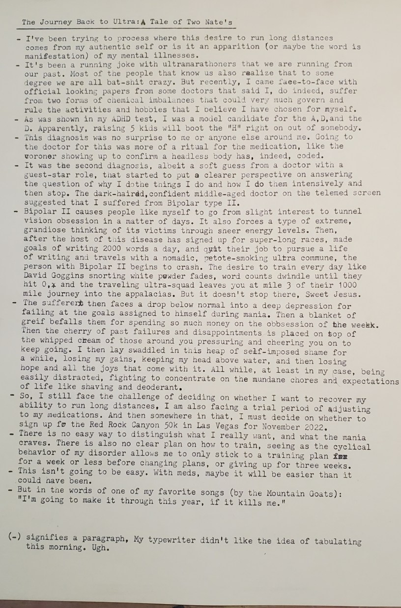 It’s been an ongoing joke with ultra marathoners that we are running from our past. Most of the people that know us also realize that to some degree we are all bat-shit crazy. But recently, I came face to face with official looking papers from some doctors that said I, indeed, suffer from two forms of chemical imbalances that could very much govern and rule the activities and hobbies that I believe I have chosen for myself.