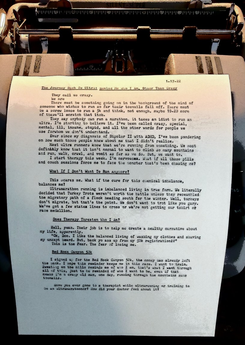 I signed up for the Red Rock Canyon 50K; the money has already left the bank. I hope this reminder keeps me in this race. I want to train. Sweating on the hills reminds me of who I am, that’s what I want through all of this, to be reminded of who I want to be, even if that means I’ll be a crazy old man, one day, running to the mountains sans toenails.